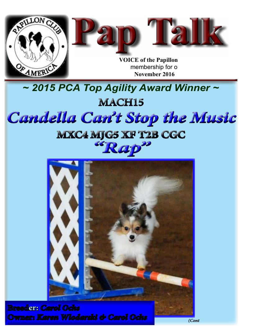 MACH15 Rap, is invited to AKC agility invitationals to be held in Orlando Fl. in December 2016, along with his brother MACH4 Disco, also owned by Karen, and Carol Ochs as 2 of the top 5 Papillons in AKC agility this year.